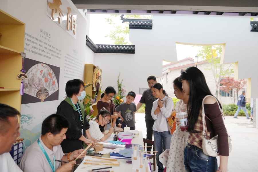 5月24日,第七届湘鄂赣皖非物质文化遗产联展在岳阳市举行。图为观众在了解岳州扇制作技艺。湖南日报全媒体记者 傅聪 摄