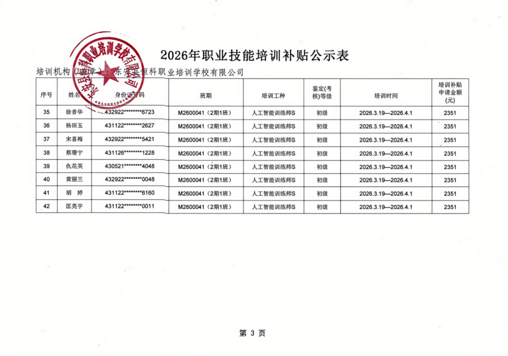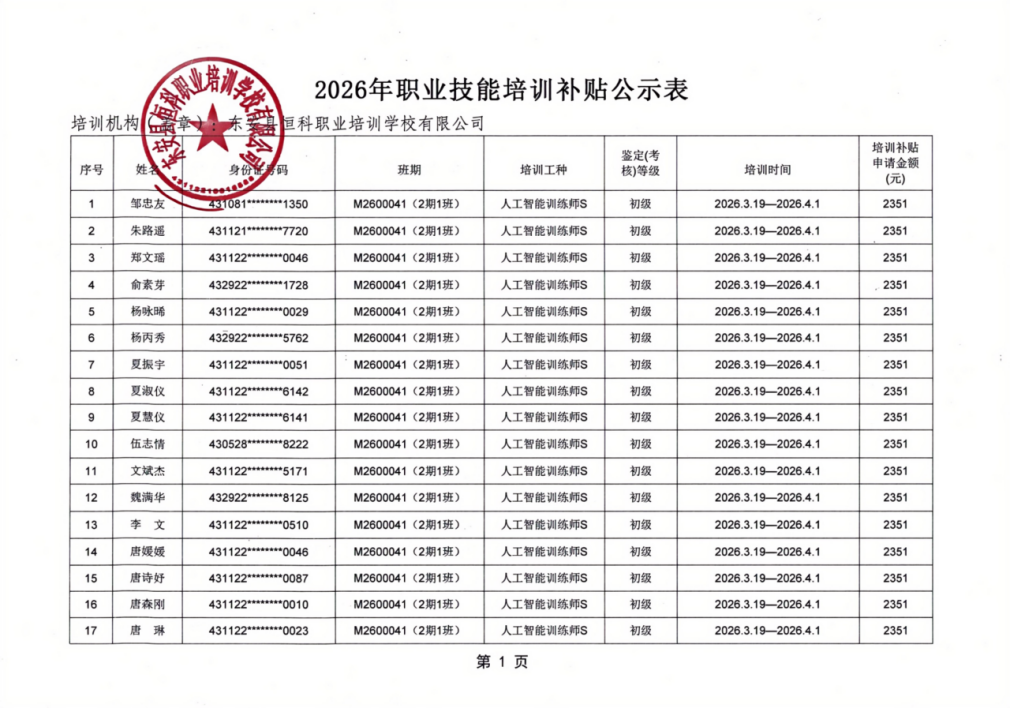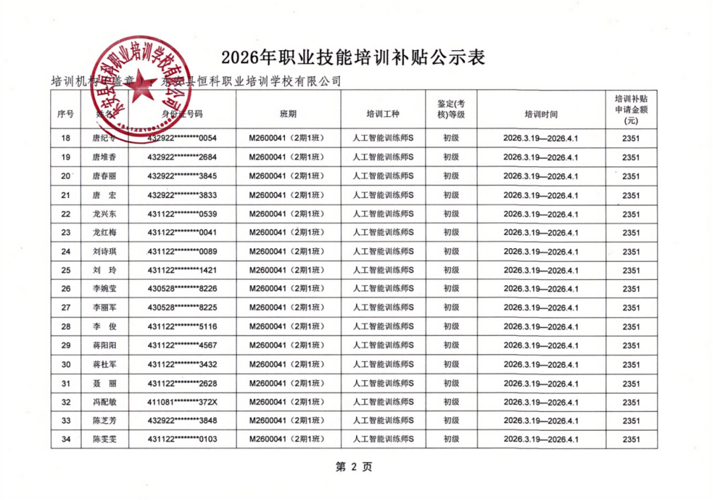 2026年职业技能培训补贴公示(东安县恒科职业培训学校第二期人工智能训练师)