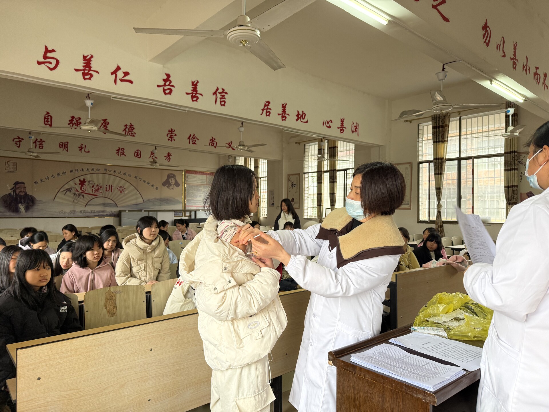 活动现场组织有序、分工明确。在疫苗接种区域,医护人员严格按照接种流程,认真核对信息、询问健康状况、讲解接种注意事项,为符合条件的31名适龄女孩规范完成二价HPV疫苗接种。接种后,学生在老师和医护人员的引导下进入留观区安静等候,确保接种安全。在留观期间,卫生院医务人员充分利用等候时间,向在场学生及老师开展健康知识宣讲。围绕“三减三健”(减盐、减油、减糖,健康口腔、健康体重、健康骨骼)主题,讲解合理膳食、科学运动、日常保健等知识;同时结合季节特点,开展灭蚊防蚊、传染病预防宣传,普及蚊虫危害、防蚊措施、环境卫生整治等相关知识,引导学生养成讲卫生、爱清洁的良好习惯。