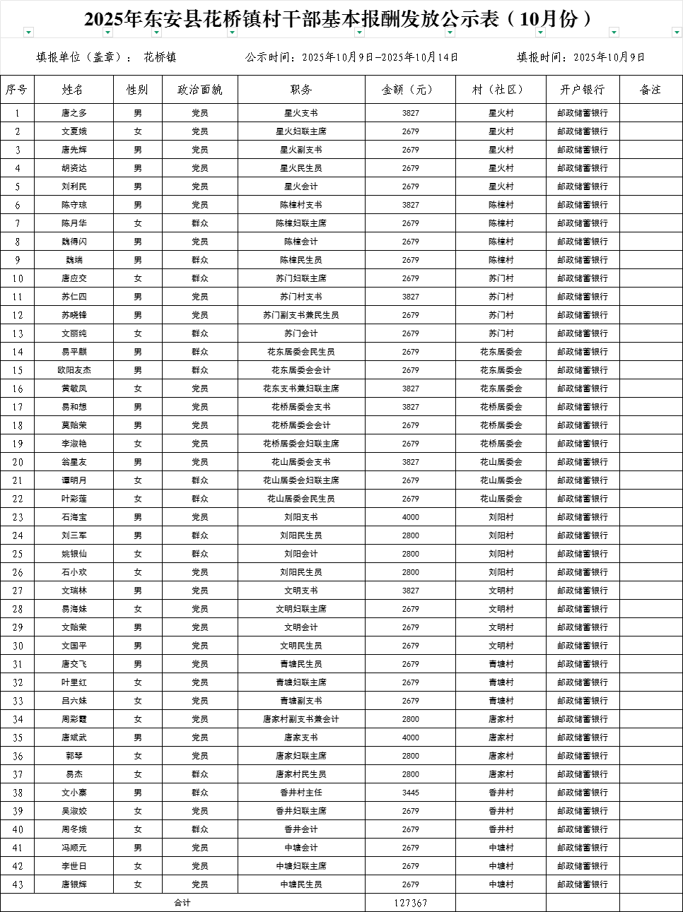 名称: 2025年10月东安县花桥镇村干部基本报酬发放公示表和正常离任村干部生活补贴发放公示表