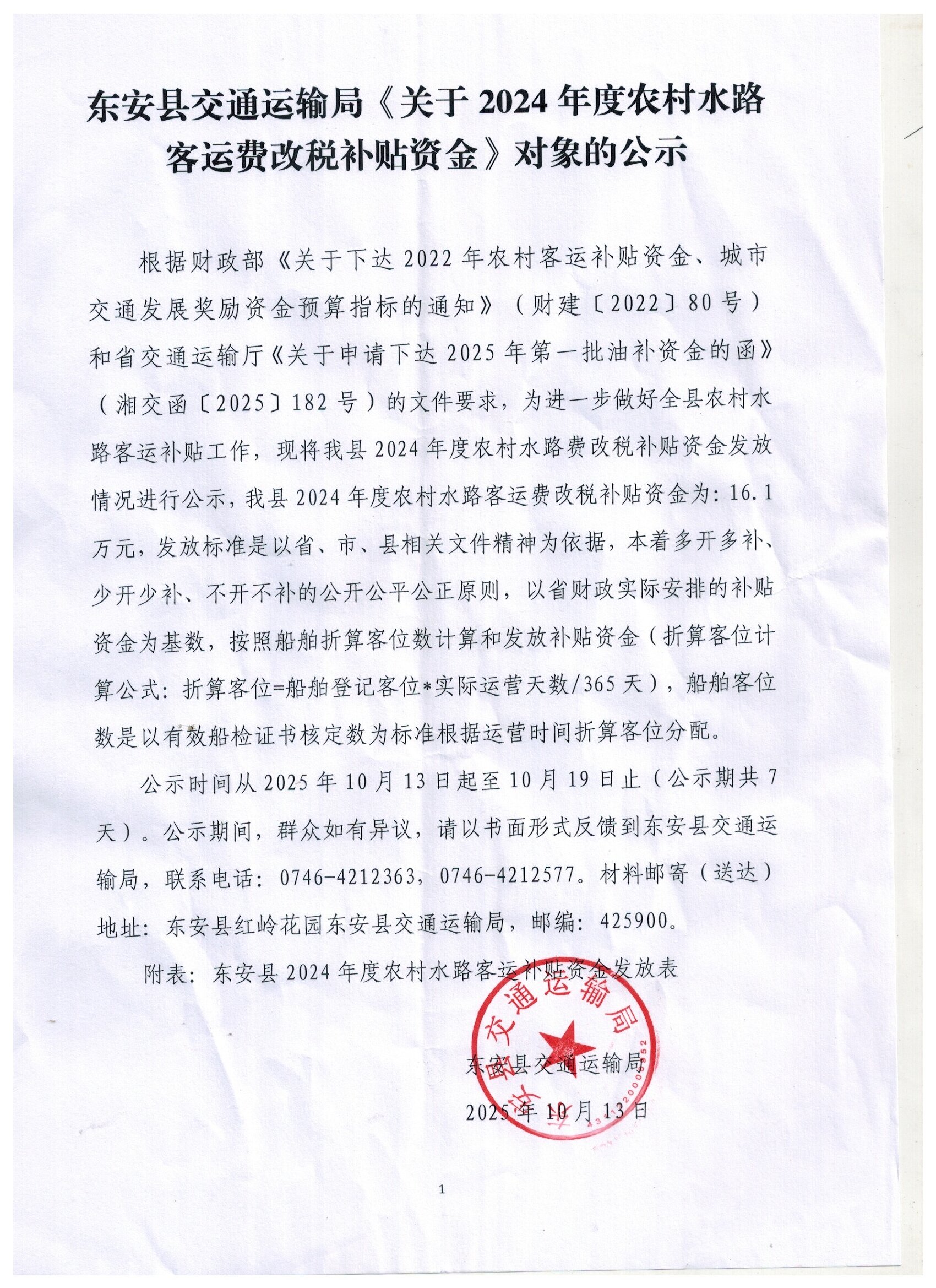 名称: 东安县交通运输局《关于2024年度农村水路客运费改税补贴资金》对象的公示