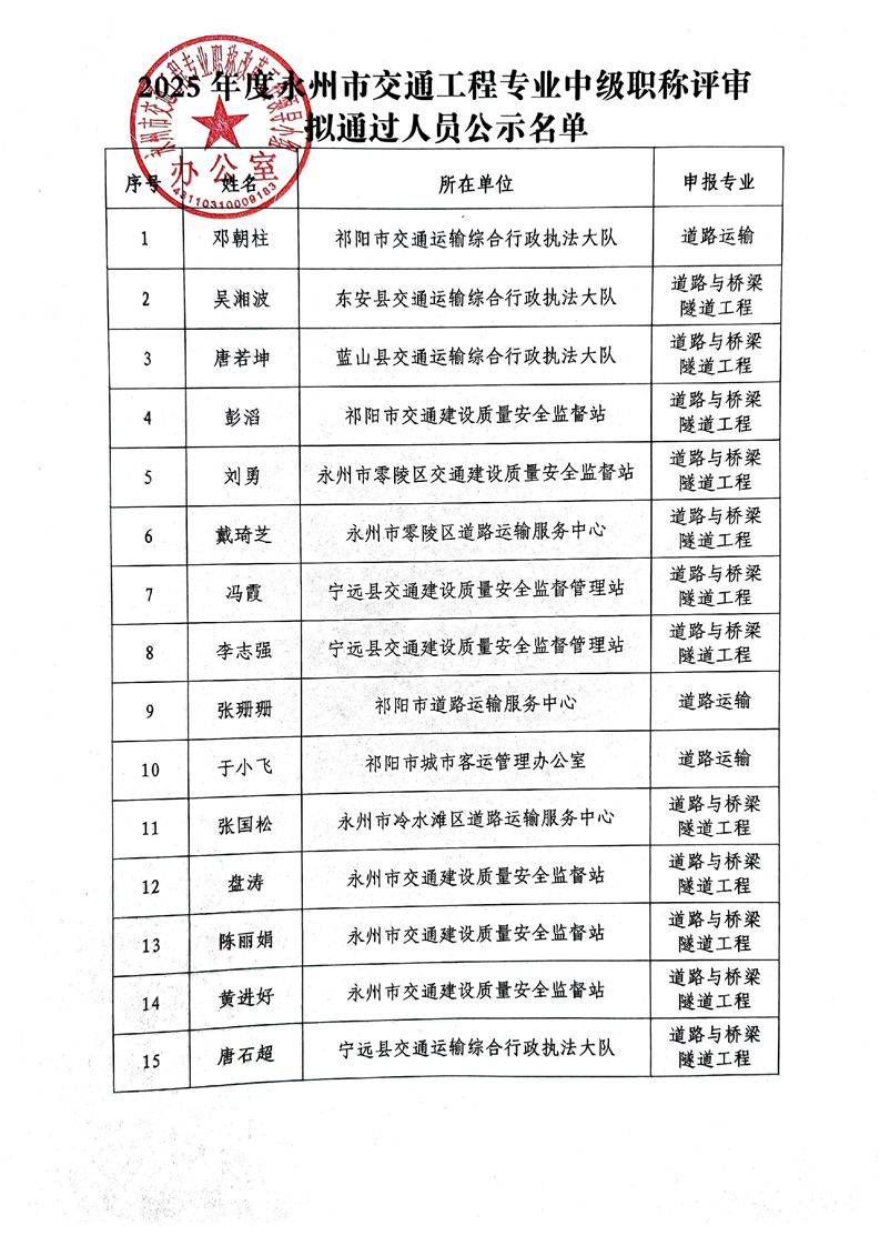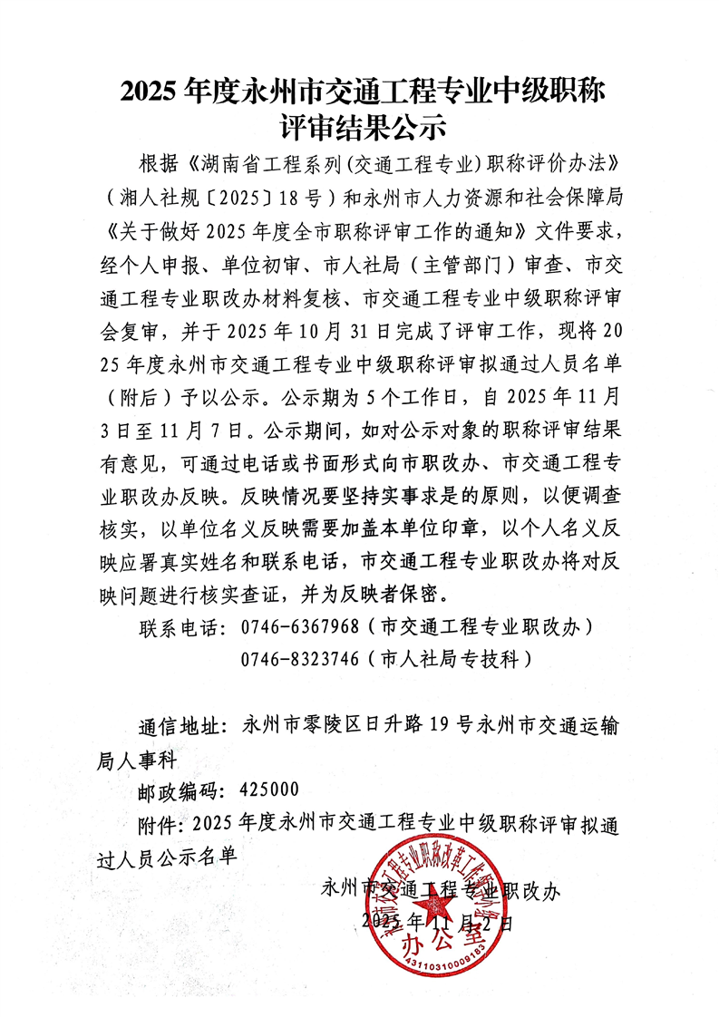 名称: 2025年度永州市交通工程专业中级职称评审结果公示