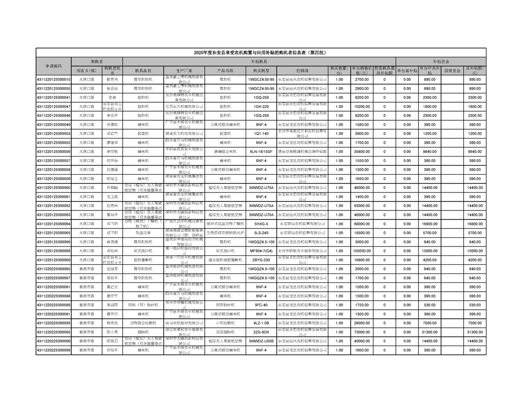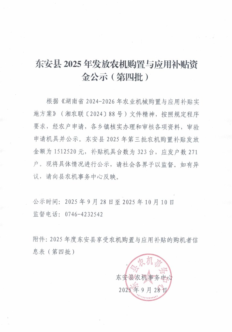 名称: 东安县2025年第四批农机购置与应用补贴资金发放的公示
