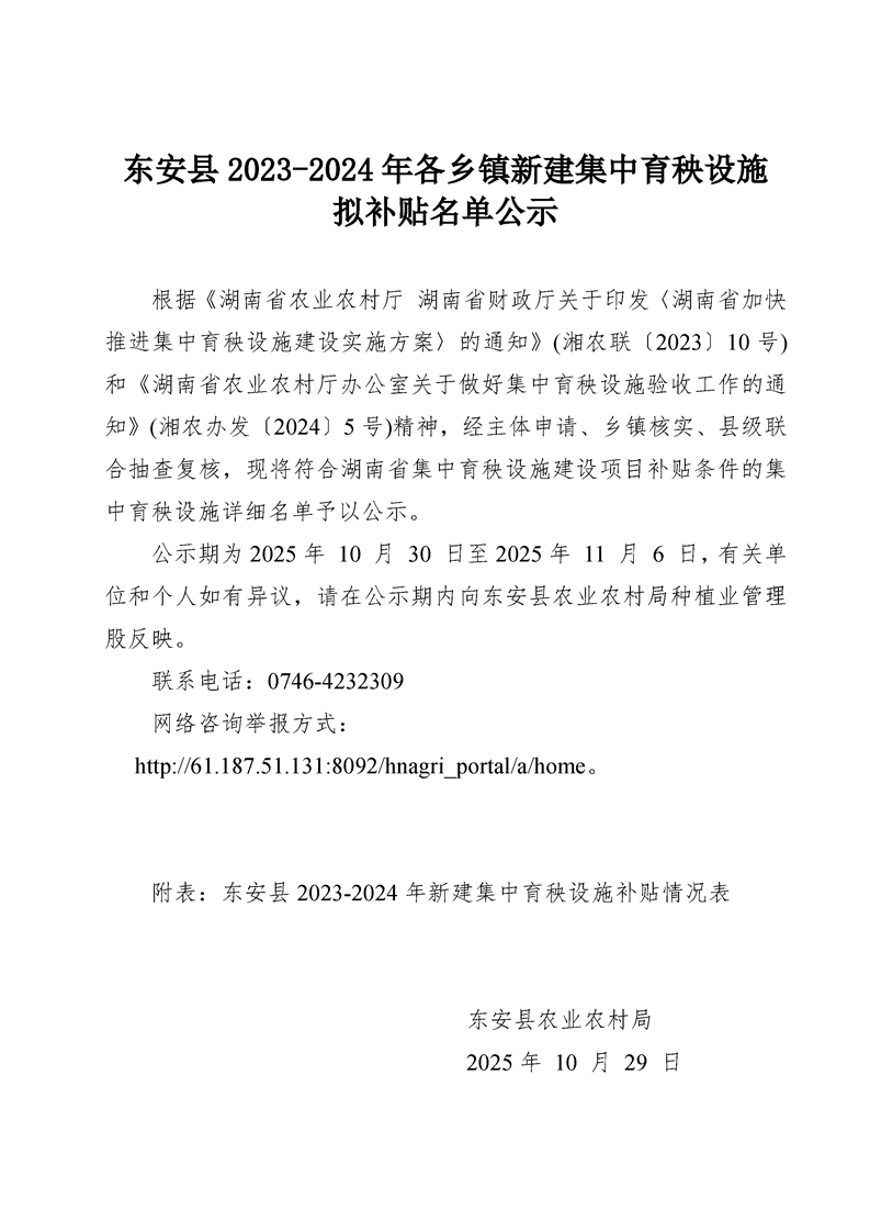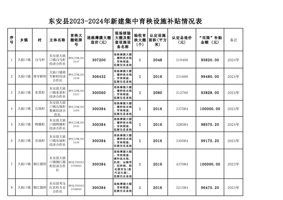 东安县2023-2024年各乡镇新建集中育秧设施拟补贴名单公示