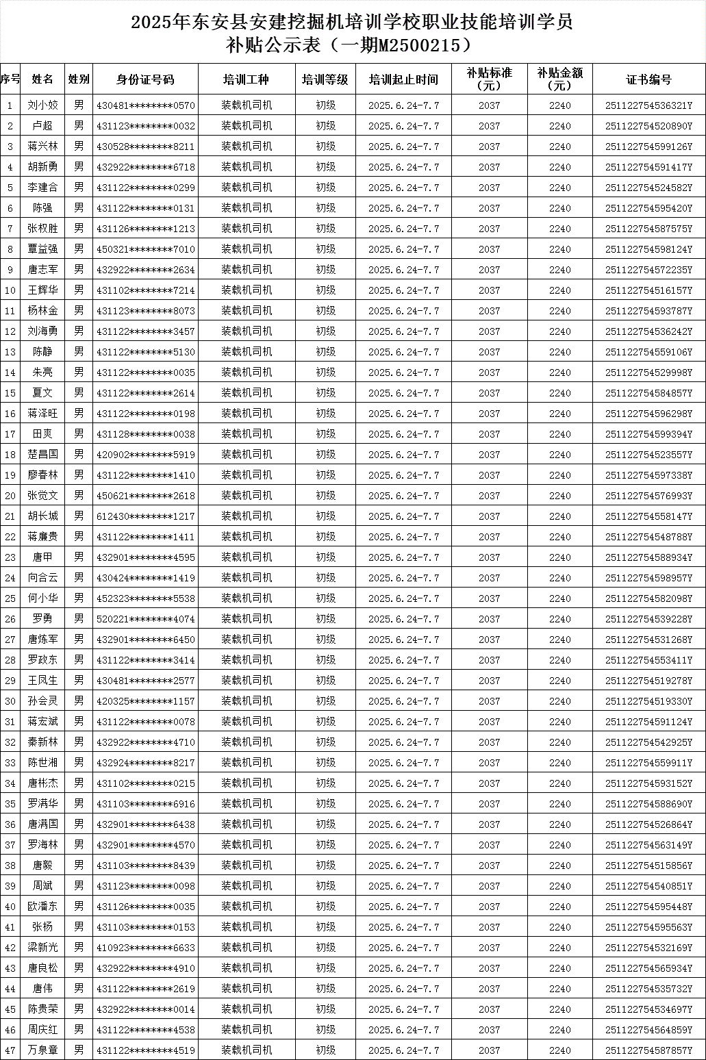 名称: 2025年东安县安建挖掘机培训学校职业技能培训学员补贴公示表(一期M2500215)