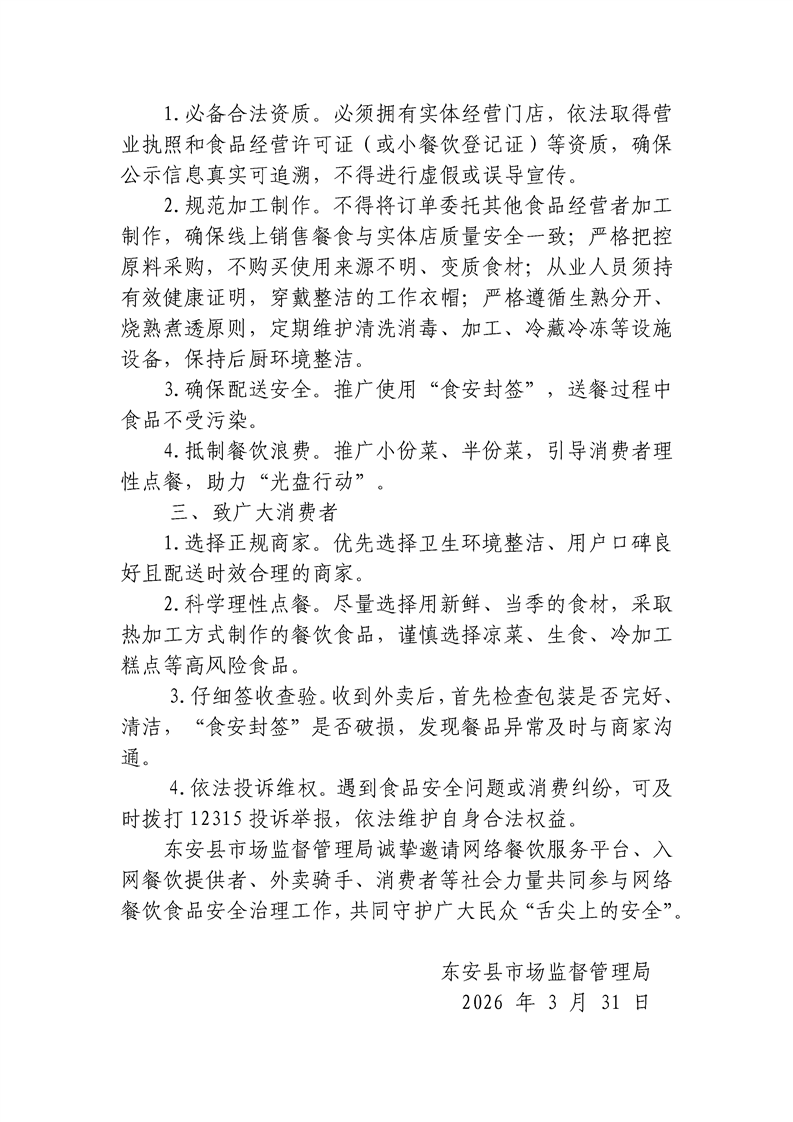 东安县市场监督管理局网络餐饮服务经营者落实食品安全主体责任倡议书