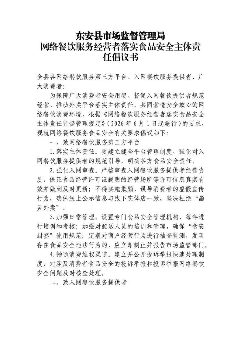 名称: 东安县市场监督管理局网络餐饮服务经营者落实食品安全主体责任倡议书
