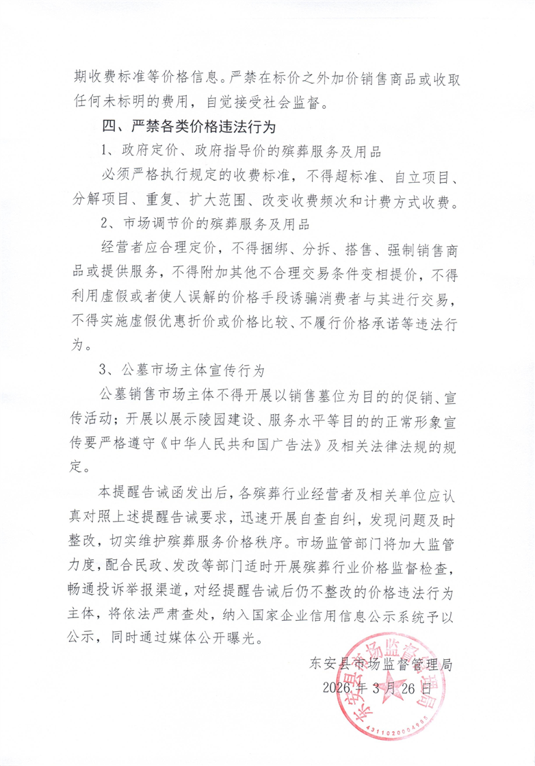 东安县市场监督管理局关于关于规范殡葬行业价格行为的提醒告诫函