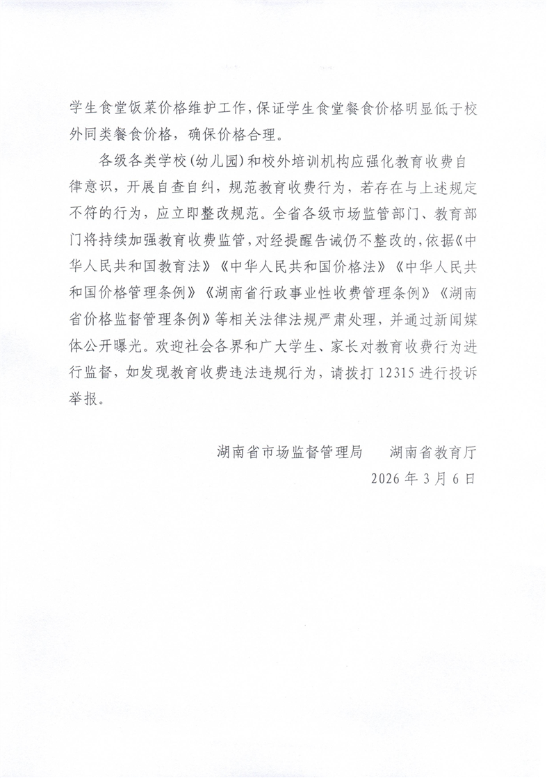 名称: 湖南省市场监督管理局湖南省 教育厅关于严格规范2026年春季教育收费政策执行的提醒告诫函