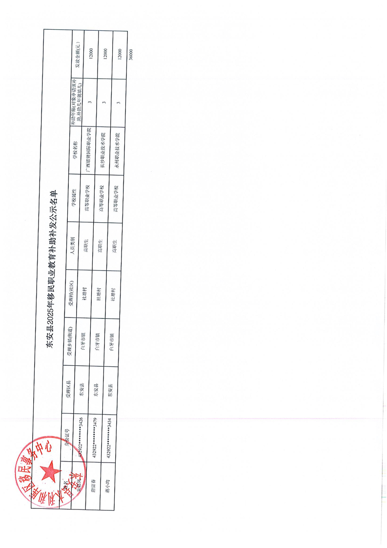 名称: 东安县2025年移民职业教育补助补发名单公示