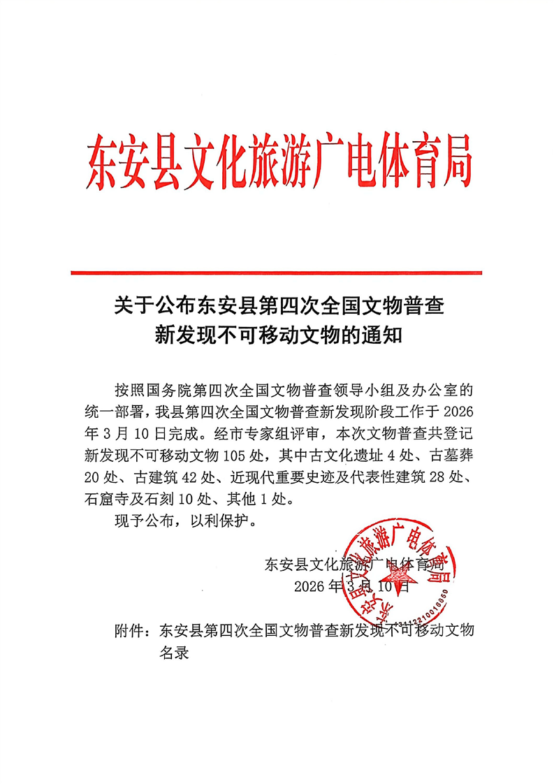 关于公布东安县第四次全国文物普查新发现不可移动文物的通知