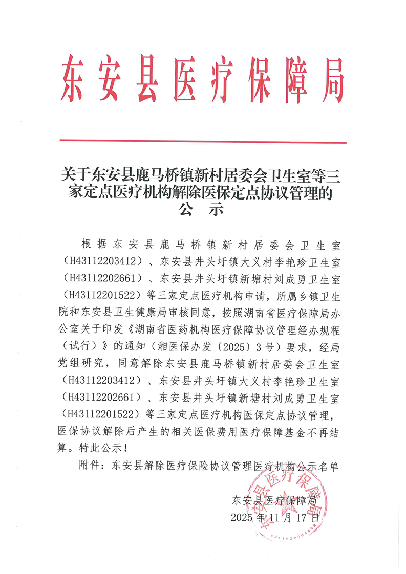 关于东安县鹿马桥镇新村居委会卫生室等三家定点医疗机构解除医保定点协议管理的公示