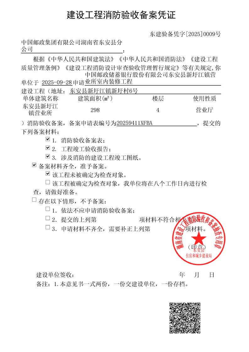名称: 中国邮政储蓄银行股份有限公司东安县新圩江镇营业所室内装修工程消防验收备案结果公示