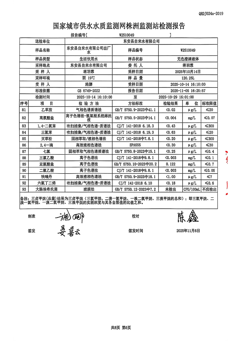 名称: 东安县自来水公司2025年10月全分析水质检测报告
