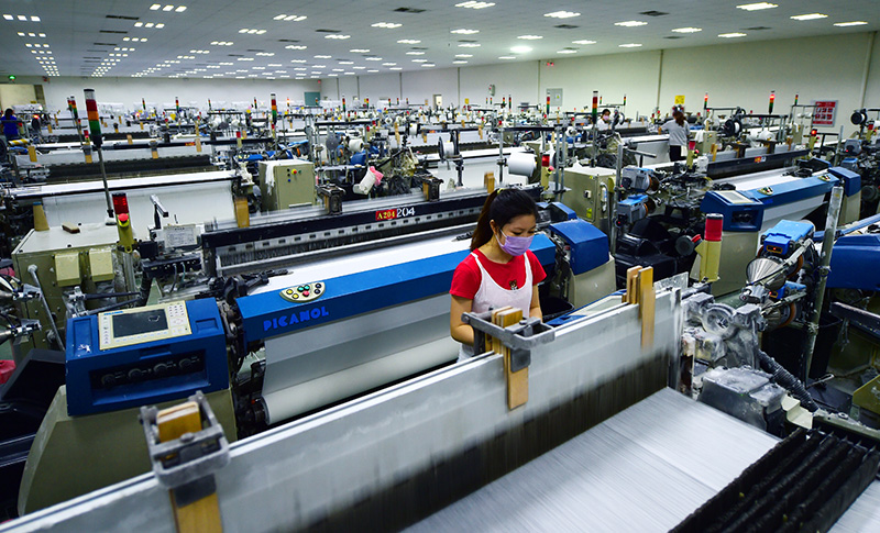 2月25日,在河北石家庄晋州市的佰斯特纺织有限公司车间里,纺织工人对布匹进行核检。