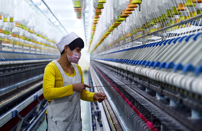 2月25日,在河北石家庄晋州市的佰斯特纺织有限公司车间里,纺织工人操作纺织设备进行生产。