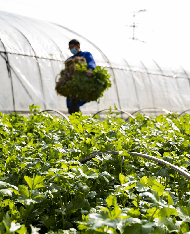 2月1日,河北省秦皇岛市海港区海阳镇鲤泮庄村立周种植农民专业合作社的社员在采摘蔬菜。