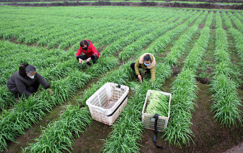 2月1日,在重庆市永川区青峰镇菱格堂村,蔬菜基地的菜农在地里收韭菜。