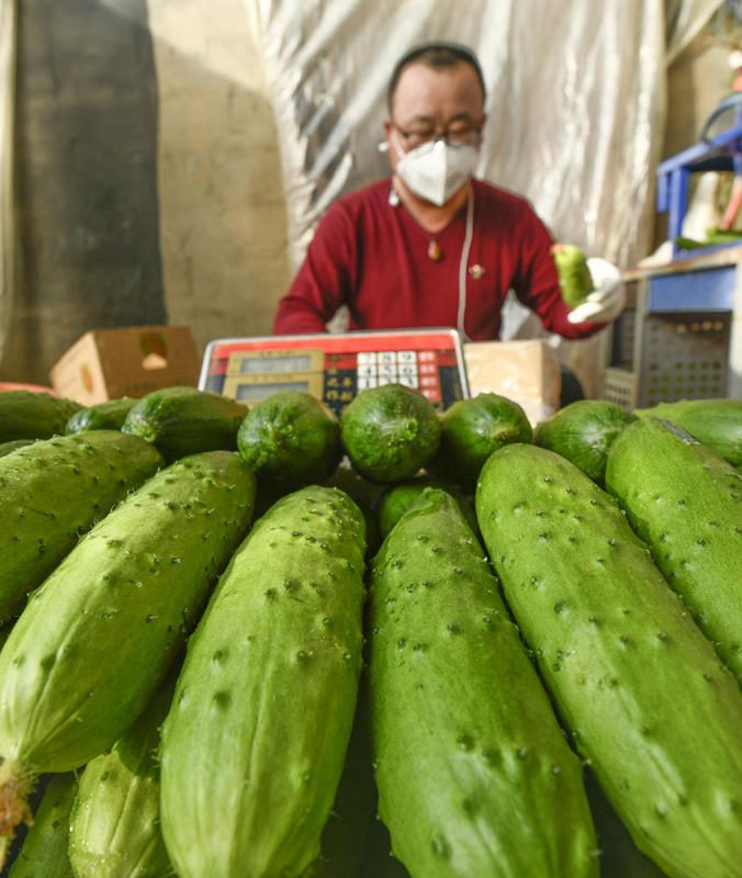 2月1日,河北唐山遵化市团瓢庄乡山里各庄村农民在包装准备外运的黄瓜。