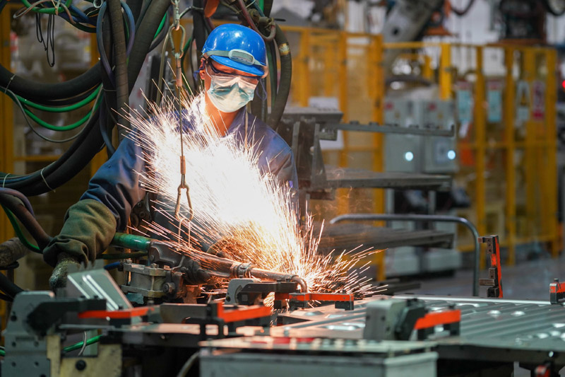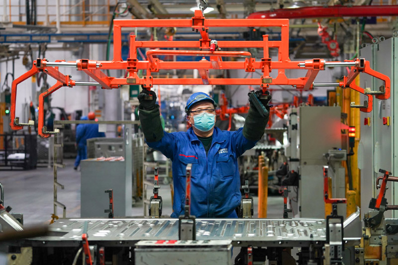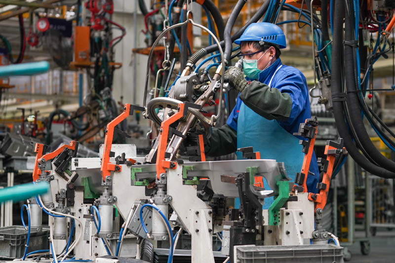 3月11日,南京依维柯汽车有限公司桥林厂区的工人在焊装车间作业。