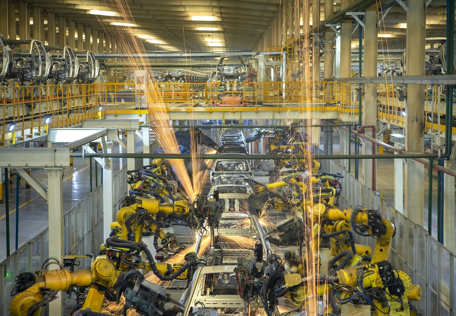 比亚迪长沙汽车基地焊装工厂,车身在自动化焊接主线进行自动化焊接。