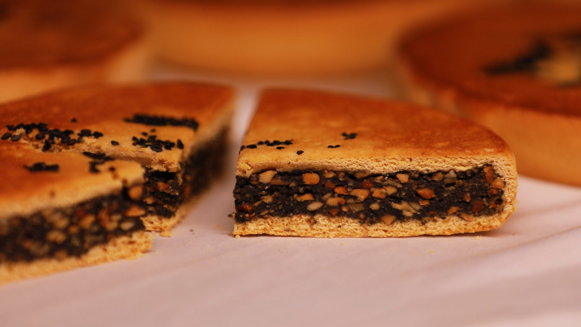 走进大盛镇刘二姐月饼加工间,木槌捶打声与芝麻香气交织。在桌子前,90后非遗技艺传承人刘增运正对着镜头直播月饼的制作流程。在他的手中,4两6钱的面皮精准包裹着5两4钱的馅料,再经手工揉制、捶打压型、印字、烘烤等工序,一块沉甸甸的月饼便新鲜出炉。在大盛镇,有着超过10家月饼企业,他们的特点、风味都各具特色,而刘增运家的核心竞争力,在于代代相传的古法技艺。