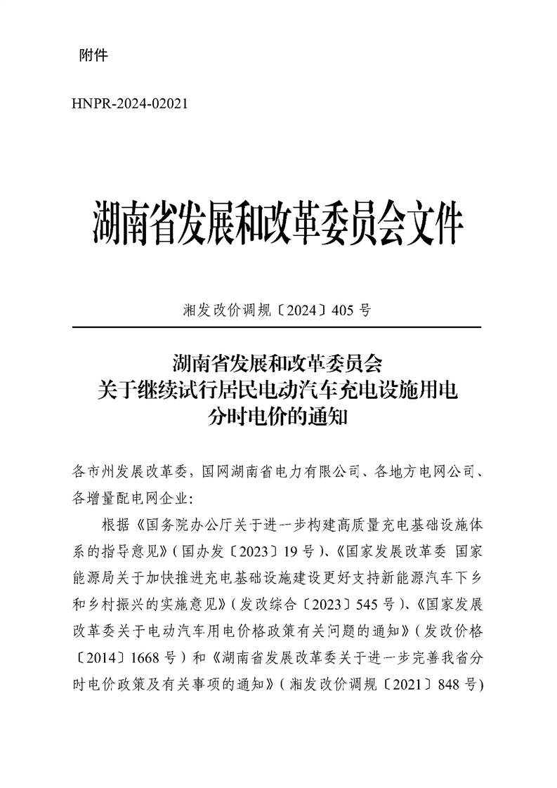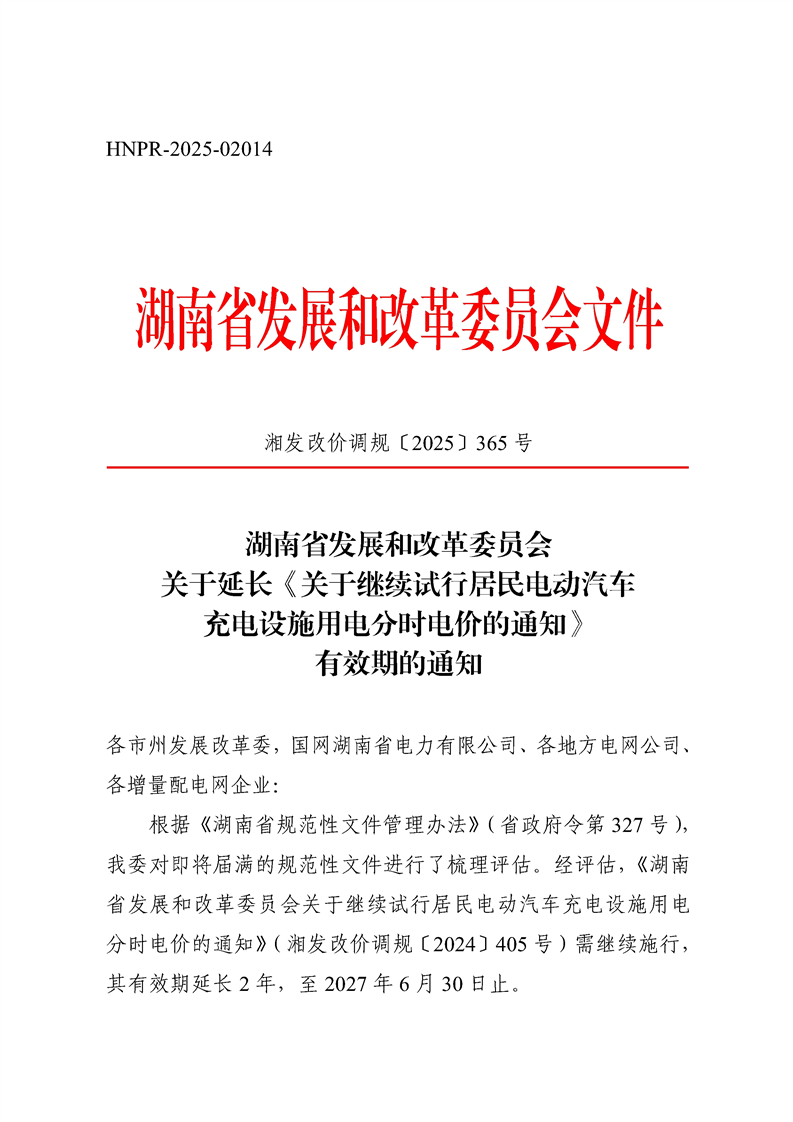 湖南省发展和改革委员会关于延长《关于继续试行居民电动汽车充电设施用电分时电价的通知》有效期的通知