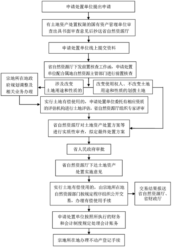(一)处置事项线上办理。省直管土地资产处置事项申报、受理、核查、审批等程序通过省直管土地资产管理信息系统全流程线上办理。