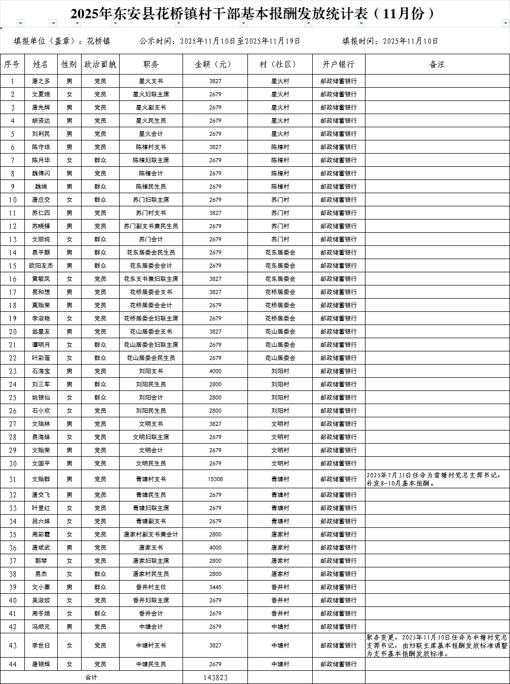 名称: 2025年11月份东安县花桥镇村干部基本报酬发放统计表、正常离任村干部生活补贴发放统计表