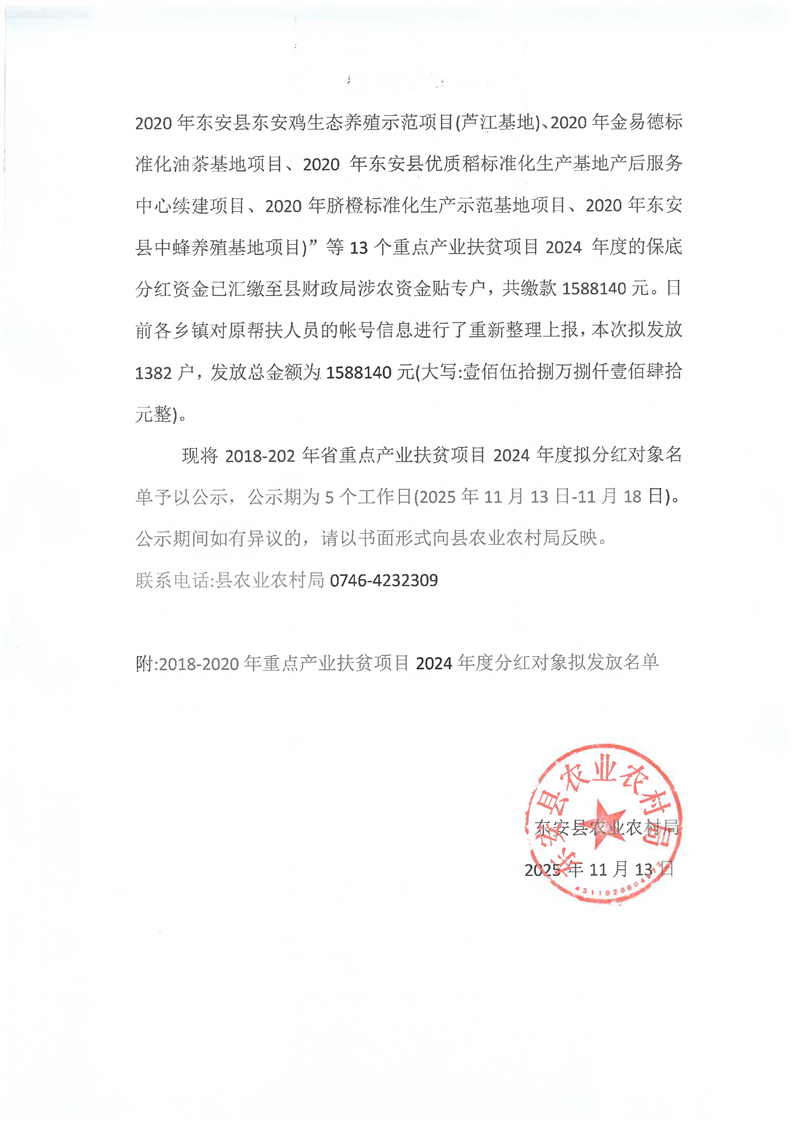 名称: 东安县2018年-2020年省重点产业帮扶项目2024年度分红发放公示