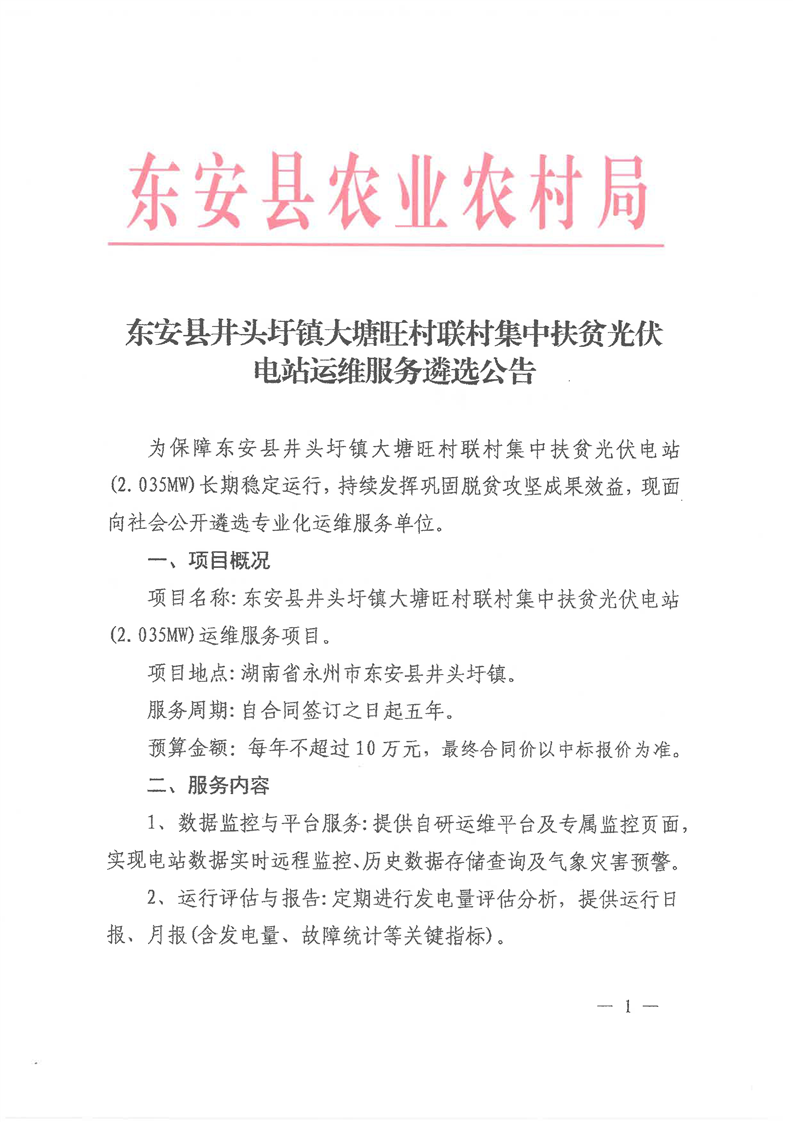 东安县井头圩镇大塘旺村联村集中扶贫光伏电站运维服务遴选公告