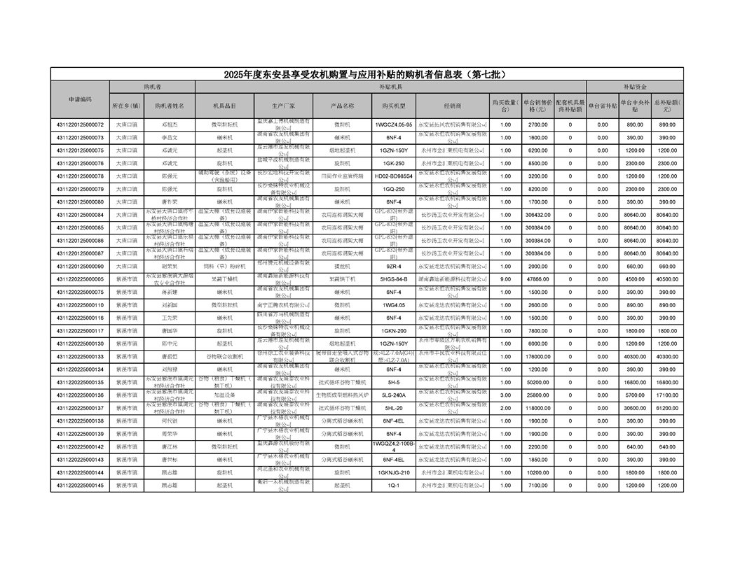 名称: 东安县2025年发放第七批农机购置与应用补贴资金的公示
