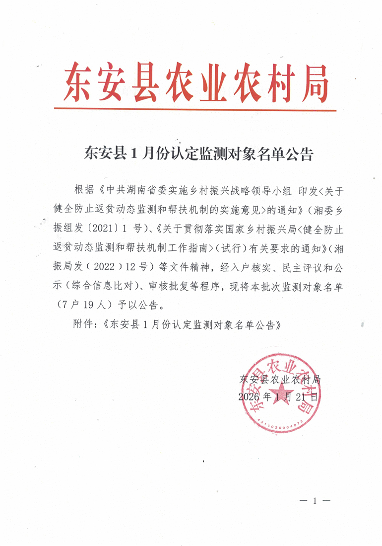 名称: 东安县2026年1月份认定监测对象名单公告