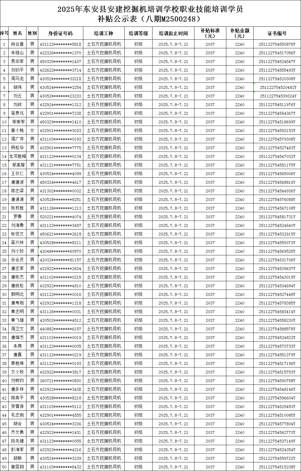 2025年东安县安建挖掘机培训学校职业技能培训学员补贴公示表(八期M2500248)