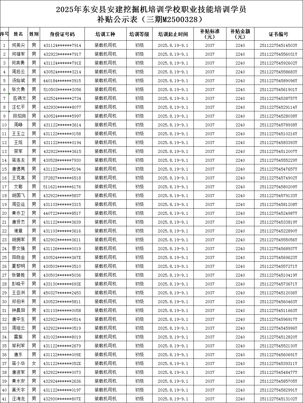 2025年东安县安建挖掘机培训学校职业技能培训学员补贴公示表(三期M2500328)