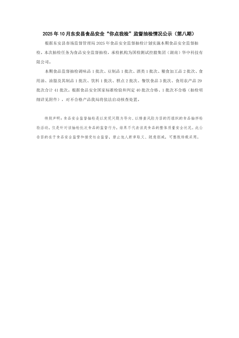 东安县市场监督管理局关于东安县食品安全“你点我检”监督抽检情况公示(第八期)