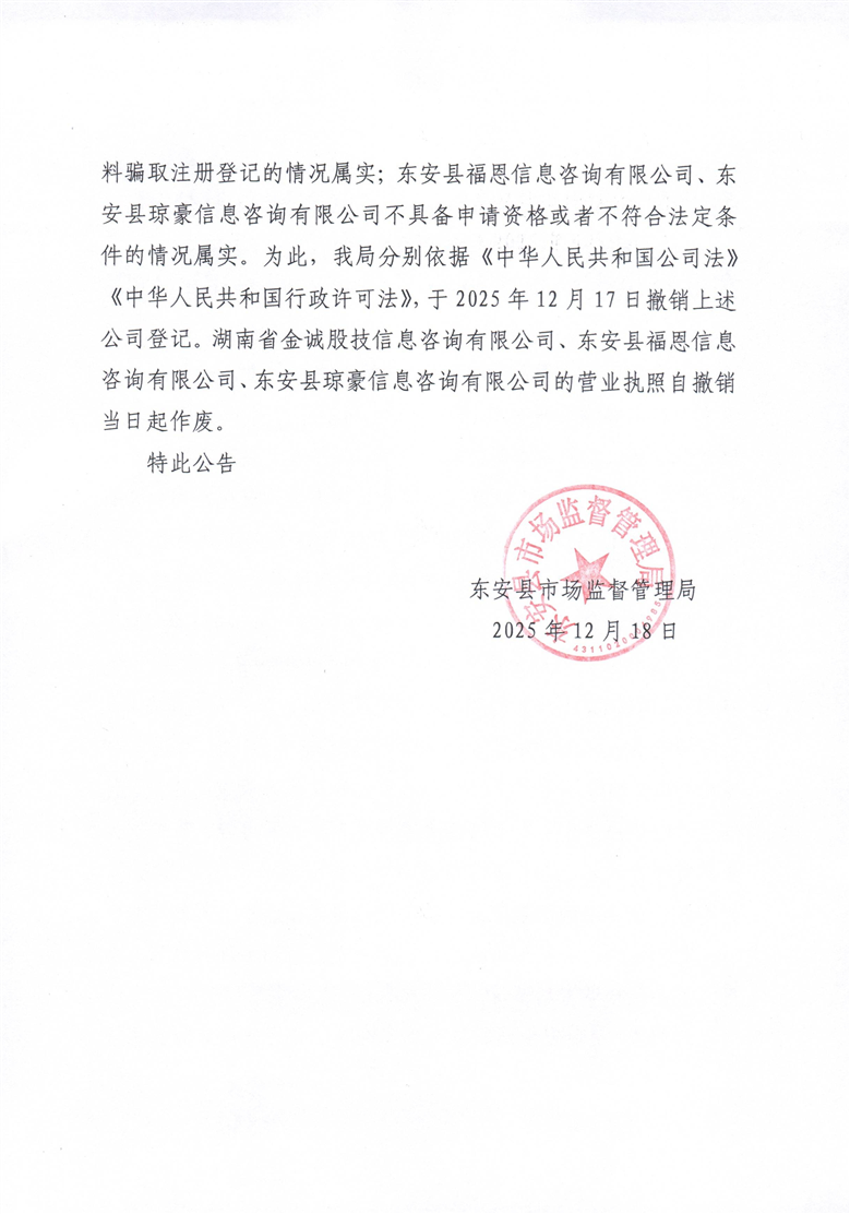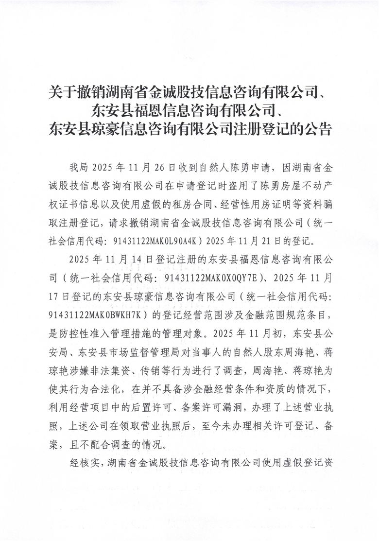 关于撤销湖南省金诚股技信息咨询有限公司、东安县福恩信息咨询有限公司、东安县琼豪信息咨询有限公司注册登记的公告