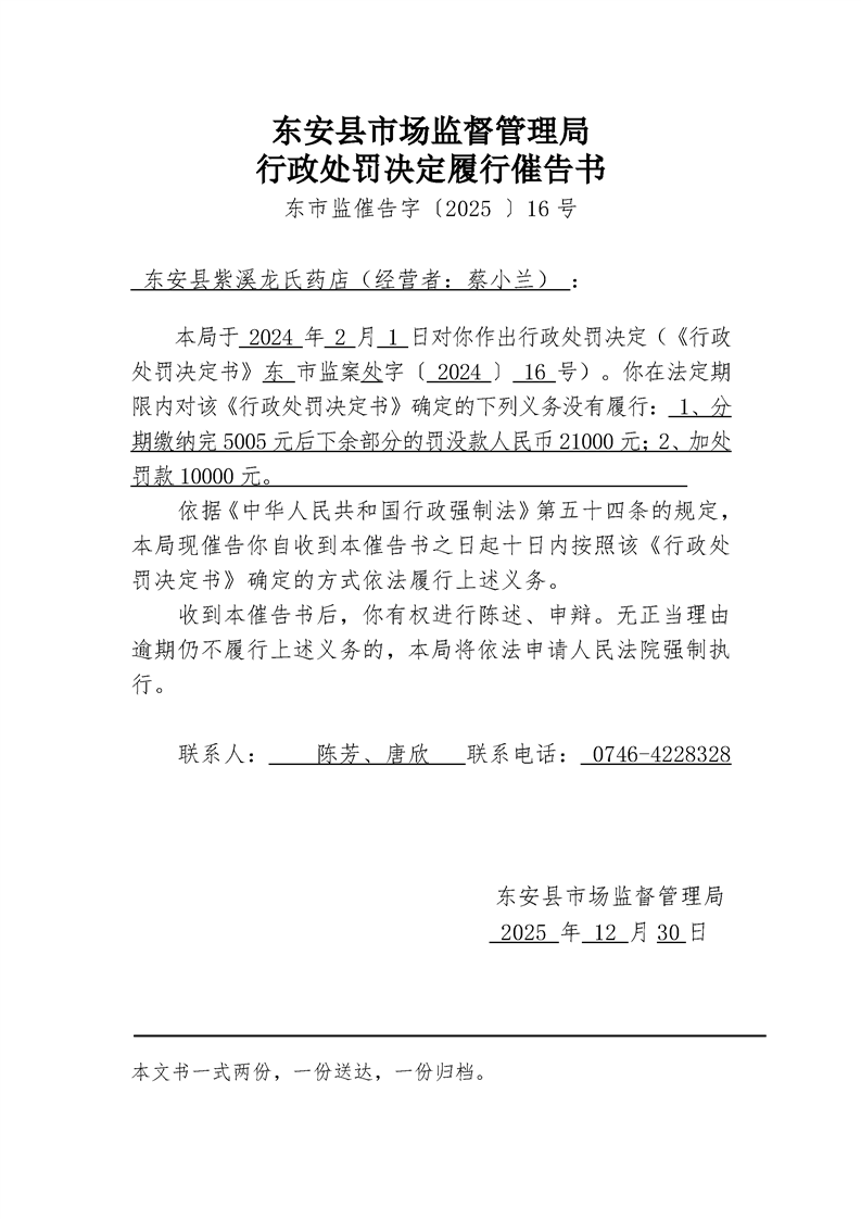 名称: 东安县市场监督管理局关于东安县紫溪龙氏药店(经营者:蔡小兰)的行政处罚决定履行催告书