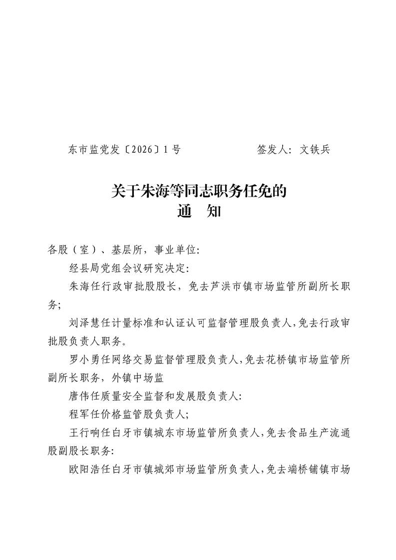 名称: 中国共产党东安县市场监督管理局党组关于朱海等同志职务任免的通知