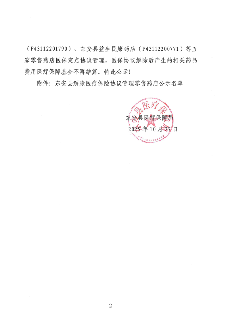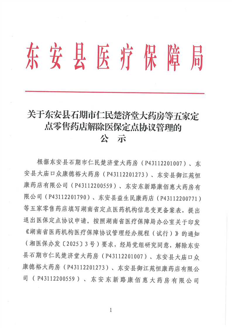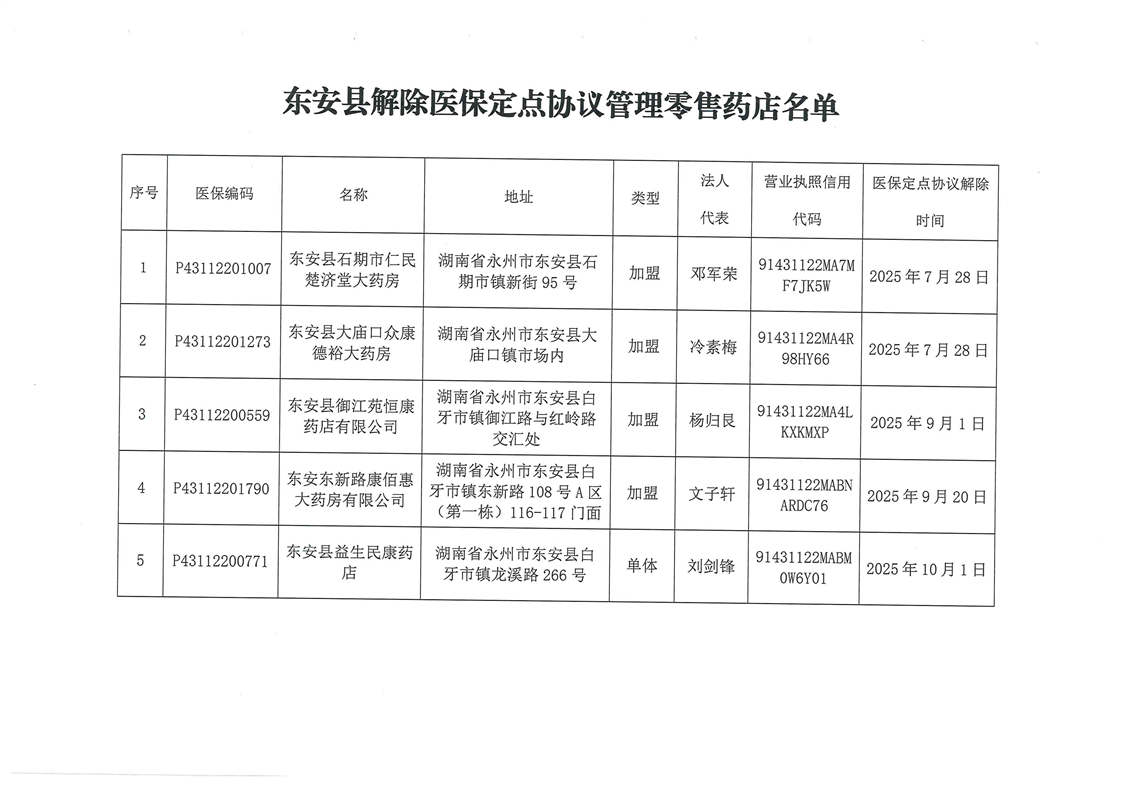 名称: 关于东安县石期市仁民楚济堂大药房等五家定点零售药店解除医保定点协议管理的公示