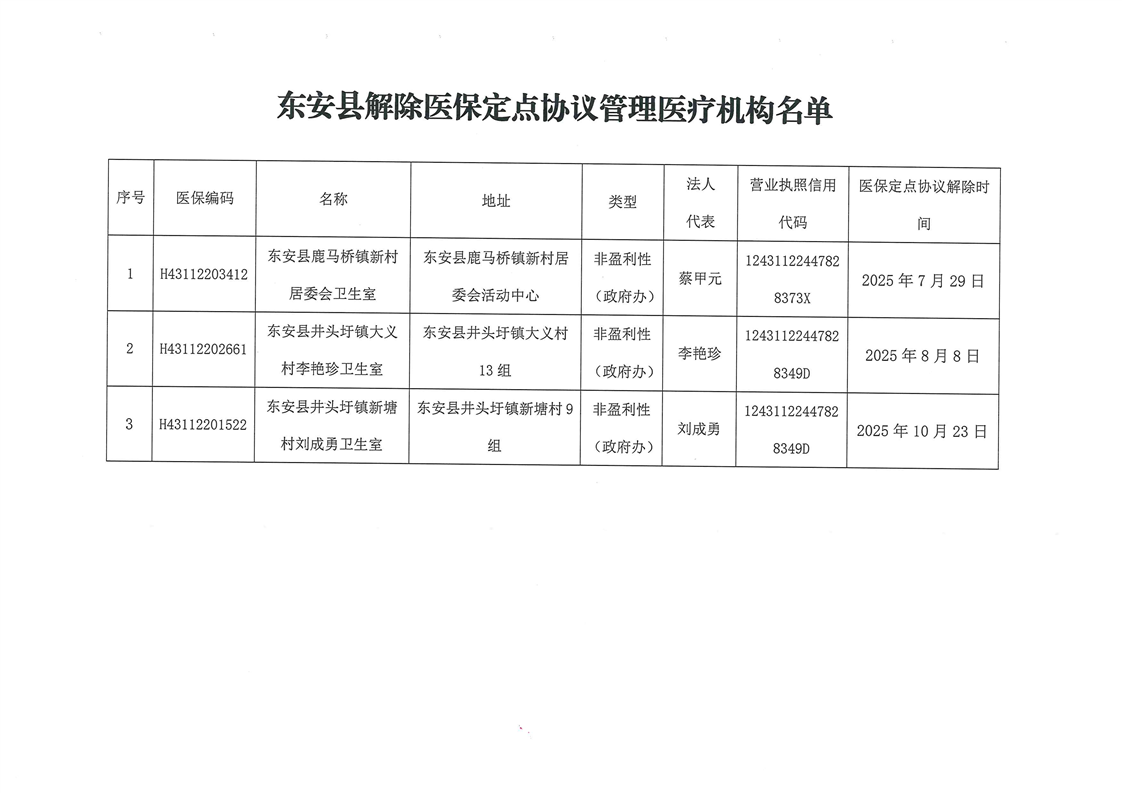 名称: 关于东安县鹿马桥镇新村居委会卫生室等三家定点医疗机构解除医保定点协议管理的公示