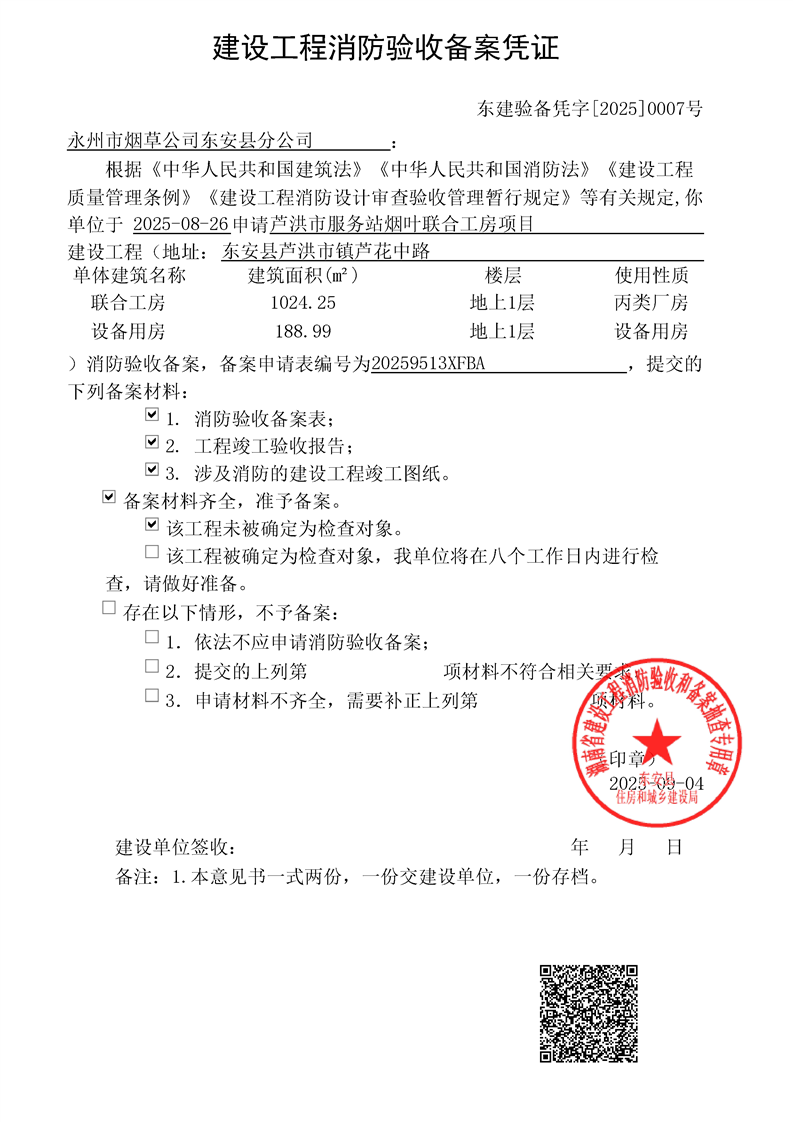 芦洪市服务站烟叶联合工房项目消防验收备案结果公示