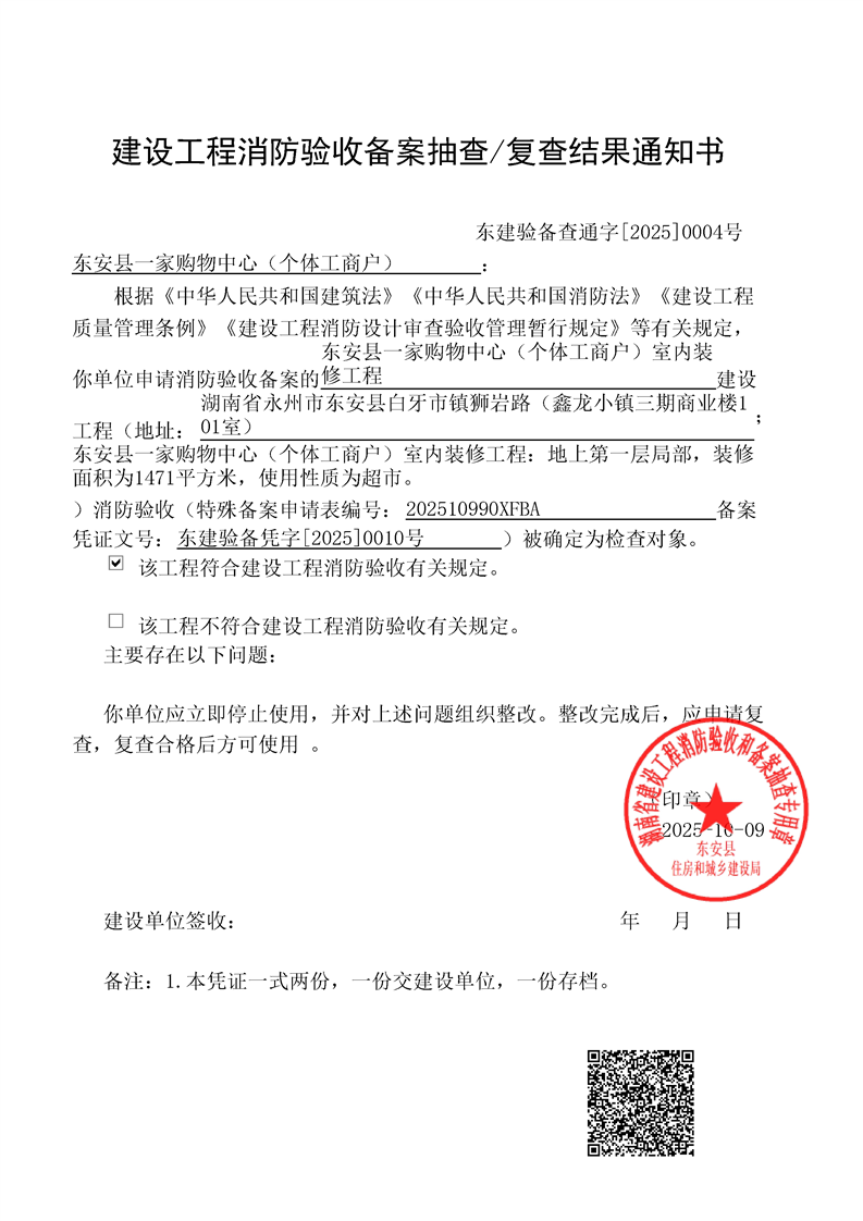 名称: 东安县一家购物中心(个体工商户)室内装修工程消防验收备案结果公示