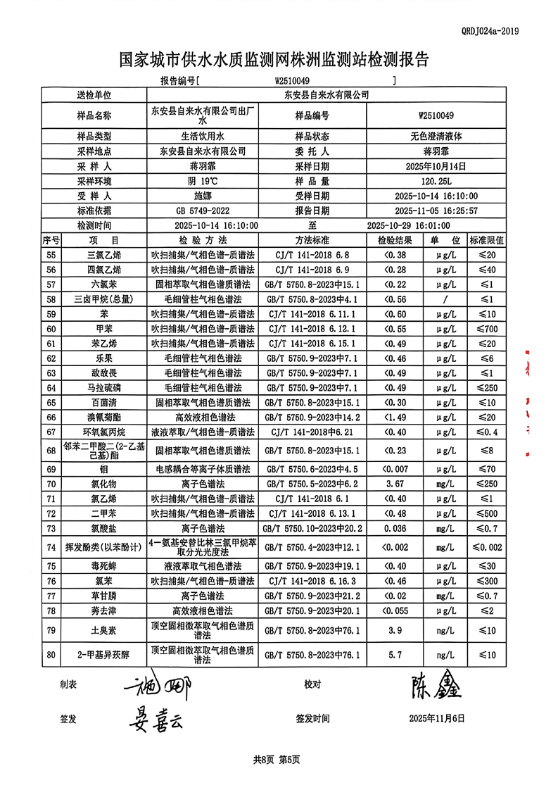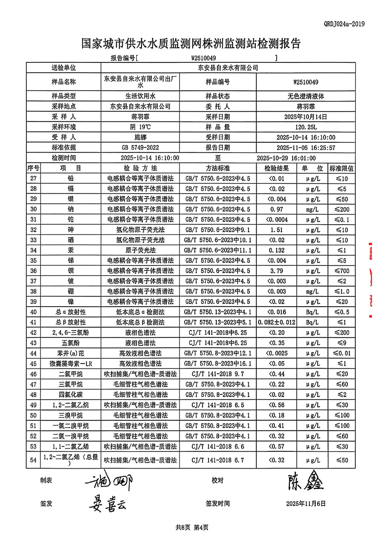 东安县自来水公司2025年10月全分析水质检测报告