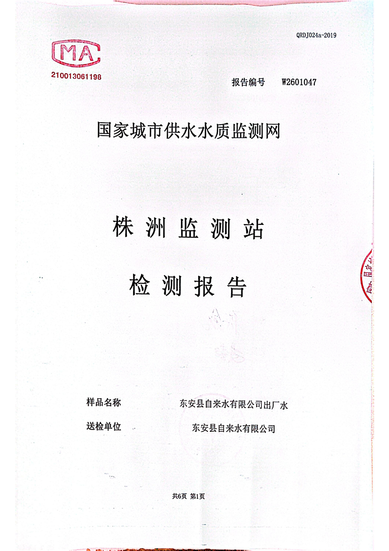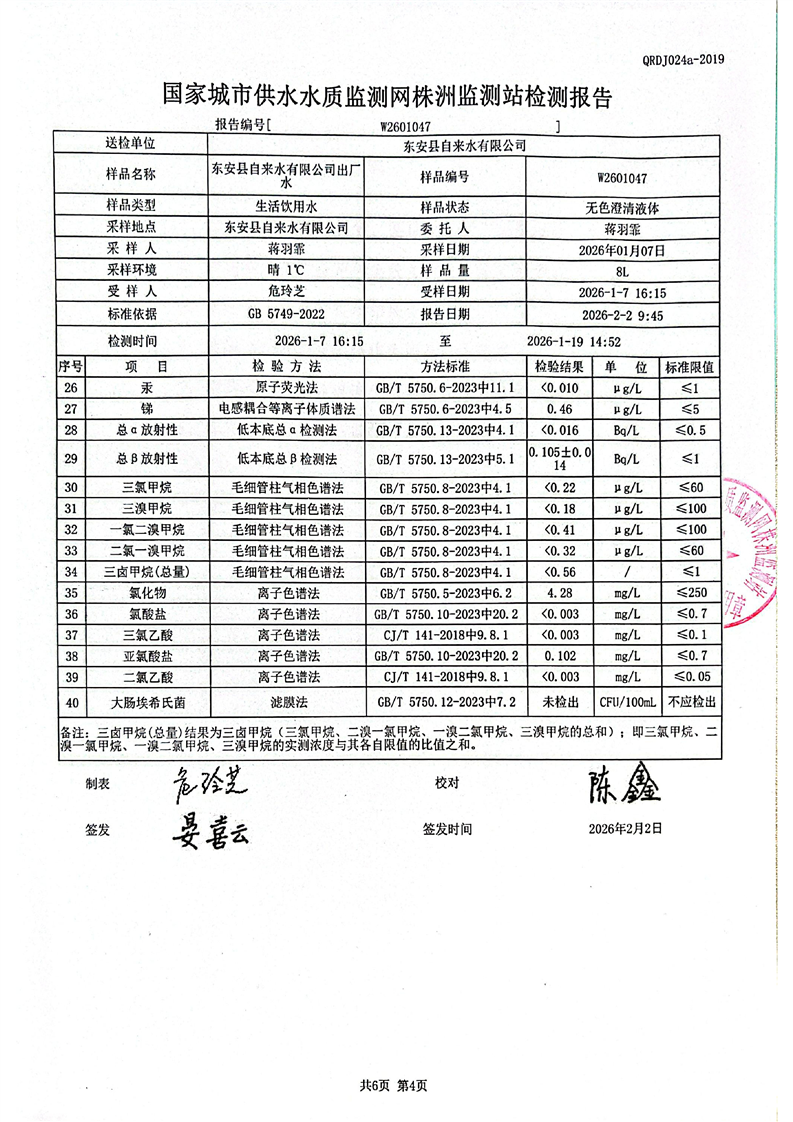 名称: 东安县自来水公司2026年1月水质检测报告