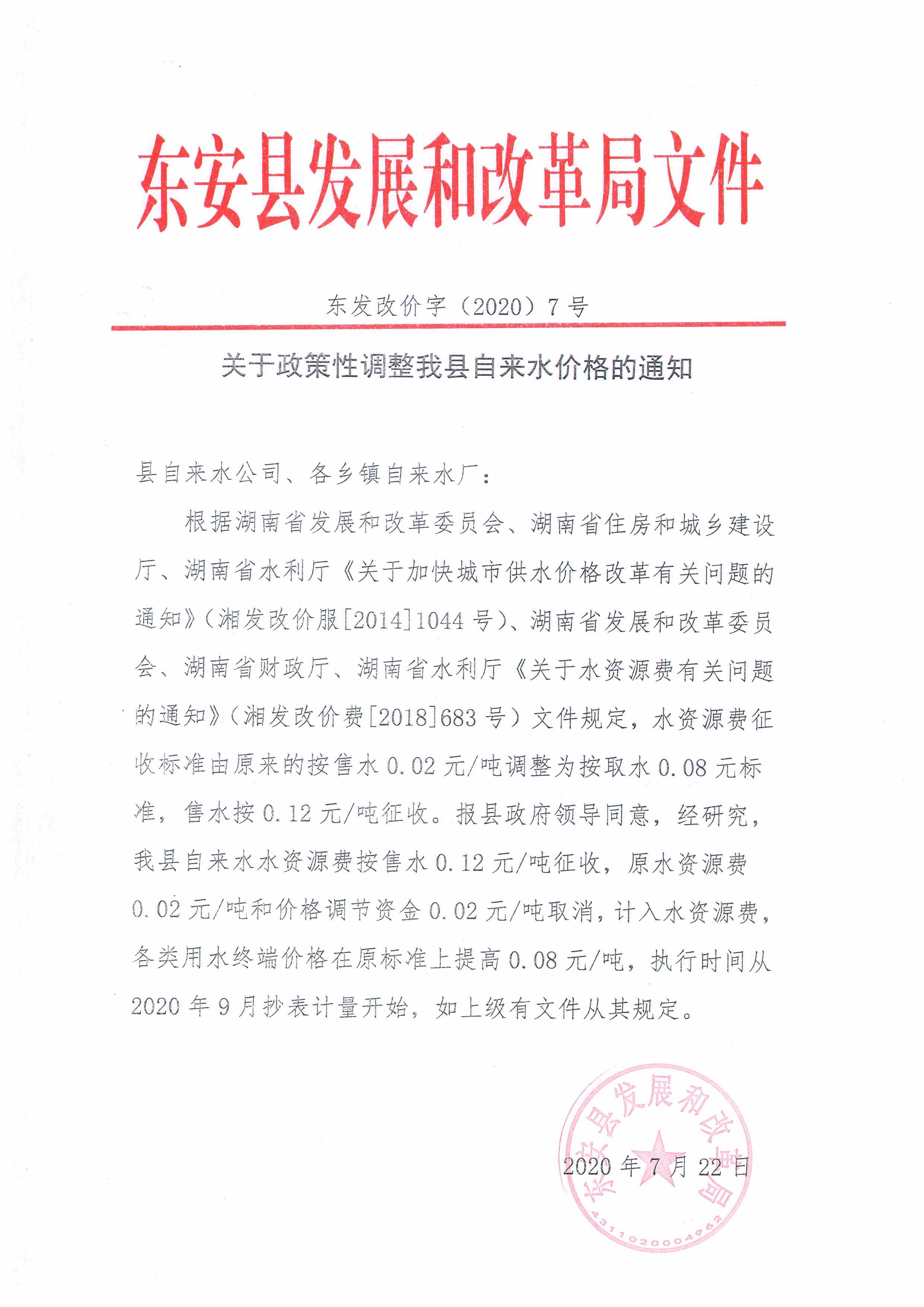 发文机关: 东安县自来水公司 发文日期: 2020-07-24
